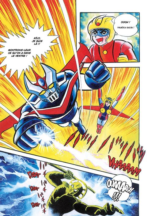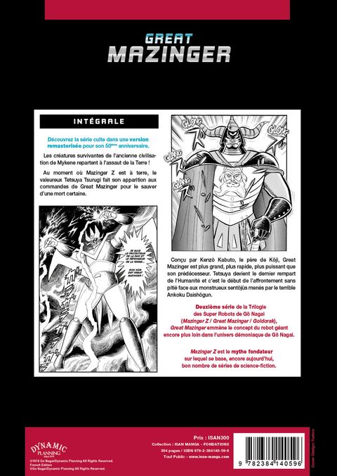 Deuxième série de la mythique Trilogie des Super Robots de Gô Nagai (Mazinger Z / Great Mazinger / Goldorak) Les créatures survivantes de l'ancienne civilisation de Mykene, menées par Ankoku Daishôgun, repartent à l'assaut de la Terre ! Mais Mazinger Z, avec à son bord Kôji Kabuto, essuie un revers cinglant contre les sentôjûs de Mykene, peu après sa victoire contre le Docteur Hell. C'est à ce moment-là que le valeureux Tetsuya Tsurugi fait son apparition aux commandes de Great Mazinger pour les sauver de la mort. Great Mazinger est un robot aux pouvoirs surpuissants, fabriqué dans la forteresse de recherche scientifique de Kenzô Kabuto, le père de Kôji en personne, un ingénieur aujourd'hui mihomme mi-machine ! C'est le début de l'affrontement sans pitié entre Great Mazinger et les terribles sentôjûs de l'armée de l'Empire de Mykene ! ® Tout Great Mazinger en UN SEUL volume ! ® Frontispices et illustrations couleurs d'origine. ® Grand format, papier haute qualité.
