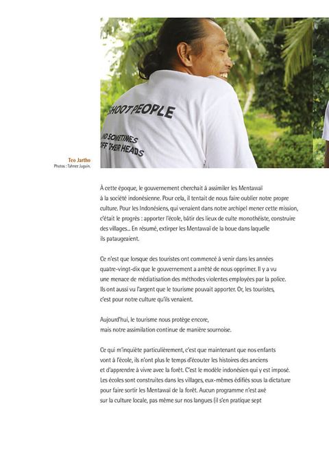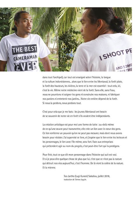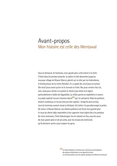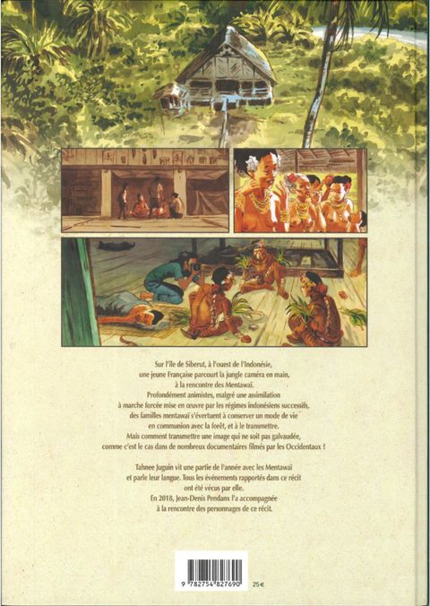 Dans l'île de Siberut, en Indonésie, les Mentawaï luttent pour conserver leur mode de vie, en totale communion avec la nature, au coeur de la jungle. Profondément animiste, malgré une assimilation à marche forcée mise en oeuvre par les régimes indonésiens successifs, la tribu des Mentawaï s'évertue à conserver ses traditions séculaires, et à les transmettre. La jungle constitue la première ressource de ses habitants, et la vie est quotidiennement ponctuée de cérémonies chamaniques destinées aux soins et au maintien de l'harmonie au sein des familles. Tahnee Juguin parle le mentawaï et vit une partie de l'année avec eux. Jean-Denis Pendanx l'a accompagnée pendant son dernier séjour dans la jungle, en 2018. Tous deux livrent ici, entre documentaire et fiction, un récit de haute volée.