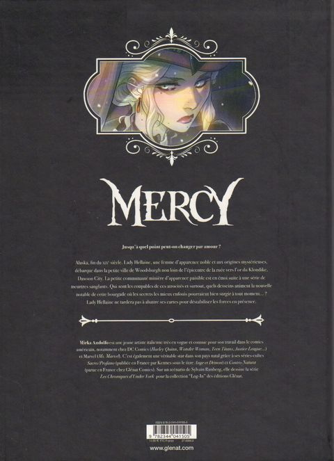 Jusqu'à quel point peut-on changer par amour  ?Alaska, fin du XIXe siècle. Hellaine, une femme d'apparence noble et aux origines mystérieuses, débarque dans la petite ville de Woodsburg non loin de l'épicentre de la ruée vers l'or du Klondike, Dawson City. Elle cherche à acheter la concession d'une mine à l'abandon. Car ce que tout le monde ignore, c'est que sous les décombres se cache un lac souterrain donnant accès à une autre dimension peuplée d'êtres cauchemardesques. Hellaine est en réalité l'un de ces êtres. Et manifestement, elle a un plan. Un plan qui va être bouleversé par l'apparition de Rory, une jeune orpheline amérindienne pour qui Hellaine va se prendre d'affection après l'avoir délivré des griffes de son agresseur...Créée par Mirka Andolfo (Contro Natura), Mercy est l'histoire d'une sorte de Dracula au féminin qui trouvera la rédemption grâce à l'amour inconditionnel d'une fille adoptive qu'elle va rencontrer par accident. Une fable romantique résolument classique mais moderne, où le Grand Nord devient le théâtre d'un fantastique horrifique proche de Entretien avec un vampire.