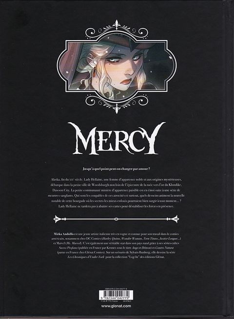 Jusqu'à quel point peut-on changer par amour ?Alaska, fin du XIXe siècle. Hellaine, une femme d'apparence noble et aux origines mystérieuses, débarque dans la petite ville de Woodsburg non loin de l'épicentre de la ruée vers l'or du Klondike, Dawson City. Elle cherche à acheter la concession d'une mine à l'abandon. Car ce que tout le monde ignore, c'est que sous les décombres se cache un lac souterrain donnant accès à une autre dimension peuplée d'êtres cauchemardesques. Hellaine est en réalité l'un de ces êtres. Et manifestement, elle a un plan. Un plan qui va être bouleversé par l'apparition de Rory, une jeune orpheline amérindienne pour qui Hellaine va se prendre d'affection après l'avoir délivré des griffes de son agresseur...Créée par Mirka Andolfo (Contro Natura), Mercy est l'histoire d'une sorte de Dracula au féminin qui trouvera la rédemption grâce à l'amour inconditionnel d'une fille adoptive qu'elle va rencontrer par accident. Une fable romantique résolument classique mais moderne, où le Grand Nord devient le théâtre d'un fantastique horrifique proche de Entretien avec un vampire.