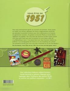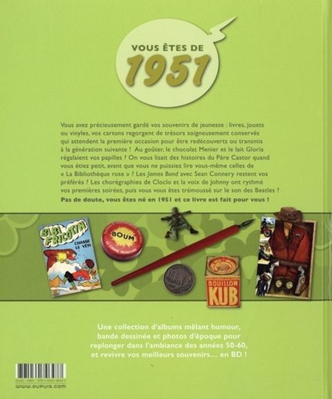 Enfant de 1951 ! Au goûter, le chocolat Meunier et le lait Gloria régalaient vos papilles ? On vous lisait des histoires du Père Castor quand vous étiez petit, avant que vous ne puissiez lire vous-même celles de La Bibliothèque rose ? À la récré, vous étiez imbattable aux billes et aux osselets ? Les James Bond avec Sean Connery restent vos préférés ? Les chorégraphies de Cloclo et la voix de Johnny ont rythmé vos premières soirées, avant que vous vous trémoussiez sur le son des Beatles ? Pas de doute, vous êtes né en 1951 et ce livre est fait pour vous !