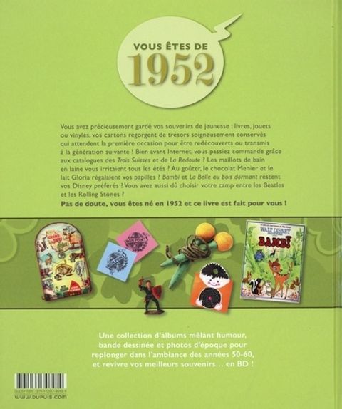 Enfant de 1952 ! Bien avant Internet, vous passiez commandes grâce aux catalogues des Trois Suisses et de la Redoute ? Les maillots de bain en laine vous irritaient tous les étés ? Au goûter, le chocolat Meunier et le lait Gloria régalaient vos papilles ? Bambi et La Belle au bois dormant restent vos Disney préférés ? Vous avez aussi dû choisir votre camp entre les Beatles et les Rolling Stones ? Pas de doute, vous êtes né en 1952 et ce livre est fait pour vous !