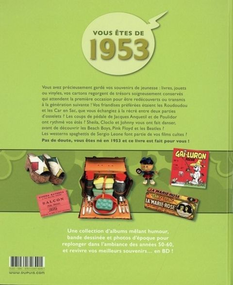 Enfant de 1953 ! Vos friandises préférées étaient les Roudoudou et les Car en Sac, que vous échangiez à la récré entre deux parties d'osselets ? À l'école, vous faisiez la collection des bons points et des images ? Les coups de pédale de Jacques Anquetil et de Poulidor ont rythmé vos étés ? Sheila, Cloclo et Johnny vous ont fait danser, avant que vous découvriez les Beach Boys, Pink Floyd et les Beatles ? Les westerns spaghetti de Sergio Leone font partie de vos films culte ? Pas de doute, vous êtes né en 1953 et ce livre est fait pour vous !