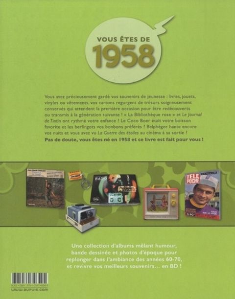 Enfant de 1958 ! À la récré, vous étiez imbattable aux billes et aux osselets ? Le Petit Gilbert et Rémi & Colette vous ont appris à lire ? Louis de Funès vous a fait pleurer de rire au cinéma ? Le présentoir Pierrot Gourmand vous fascinait, et vous ne pouviez pas résister aux chewing-gum Tarzan, aux Coco Boer et autres Mistral Gagnant ? Vous avez tremblé devant Belphégor, et vous étiez captivé par Thierry la Fronde ? Pas de doute, vous êtes né en 1950 et ce livre est fait pour vous !