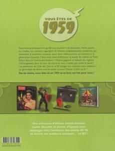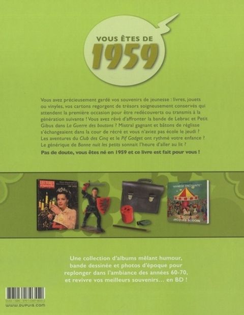 Enfant de 1959 ! À la récré, vous étiez imbattable aux billes et aux osselets ? Le Petit Gilbert et Rémi & Colette vous ont appris à lire ? Louis de Funès vous a fait pleurer de rire au cinéma ? Le présentoir Pierrot Gourmand vous fascinait, et vous ne pouviez pas résister aux chewing-gum Tarzan, aux Coco Boer et autres Mistral Gagnant ? Vous avez tremblé devant Belphégor, et vous étiez captivé par Thierry la Fronde ? Pas de doute, vous êtes né en 1950 et ce livre est fait pour vous !