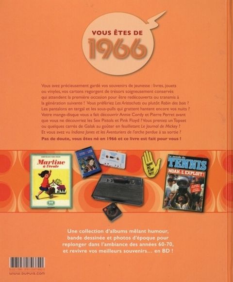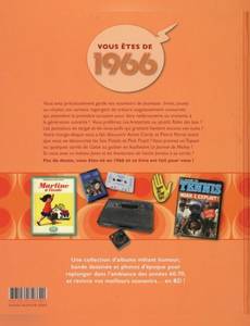 Une collection mêlant avec humour photos d'époque et bande dessinée, qui ravivera les souvenirs de jeunesse ! "Robin des bois" est votre Disney culte ? Votre mange-disque vous a fait découvrir Sheila et Henri Salvador ? Les pantalons en tergal et les sous-pulls qui démangent hantent encore vos nuits ? Vous avez découvert "Astérix" dans Pilote et "Gai-Luron" dans Pif Gadget ? Les topsets étaient vos friandises favorites ? Et vous avez vu "SOS Fantômes" à sa sortie ? Pas de doute, vous êtes né en 1966 et ce livre est fait pour vous !