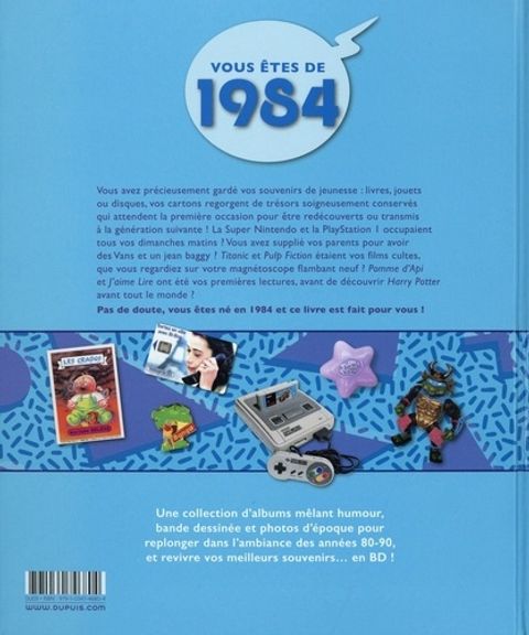 Les Roll'Up et les Frizzy Pazzy étaient vos bonbons préférés&nbsp ; ? La Mega Drive et la Super Nintendo occupaient tous vos dimanches matin&nbsp ; ? Vous avez supplié vos parents pour avoir des Vans et un jean baggy&nbsp ; ? Titanic et Pulp Fiction étaient vos films culte, que vous regardiez sur votre magnétoscope flambant neuf&nbsp ; ? Pomme d'Api et Tom-Tom et Nana ont été vos premières lectures, avant que vous découvriez Harry Potter avant tout le monde ? Pas de doute, vous êtes né en 1984 et ce livre est fait pour vous&nbsp ; !