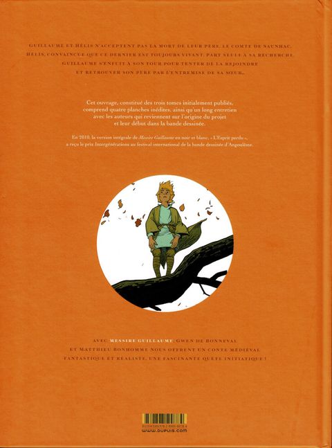 Guillaume de Saunhac n'a jamais pu accepter la mort de son père. Et lorsque sa mère accepte la proposition d'union de messire de Brifaut, il vit mal les perspectives de compagnie de ce beau-père si peu apprécié. Le jour du départ pour leur nouvelle demeure, sa sœur, Hélis, disparaît. Guillaume est déchiré : doit-il suivre sa mère ? Partir à la recherche de sa sœur ? Devait-il la croire lorsqu'elle affirmait que leur père n'était pas mort ?... Guillaume choisit finalement de retrouver Hélis. Après avoir échappé aux hommes de Brifaut et à de cruels mercenaires, Guillaume fait la rencontre inattendue d'un chevalier solitaire et bienveillant qui accepte de l'aider : Brabançon. Au fil des jours, Guillaume se découvrira des aptitudes étonnantes. Tout au long du voyage apparaîtront des présages qui l'encourageront à persévérer. De plus en plus étranges, de plus en plus difficiles à croire.Avec Messire Guillaume, Gwen de Bonneval et Matthieu Bonhomme nous offrent un conte médiéval teinté de fantastique et de psychanalyse à redécouvrir absolument !