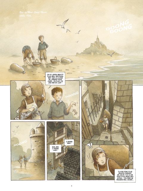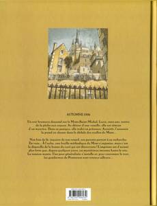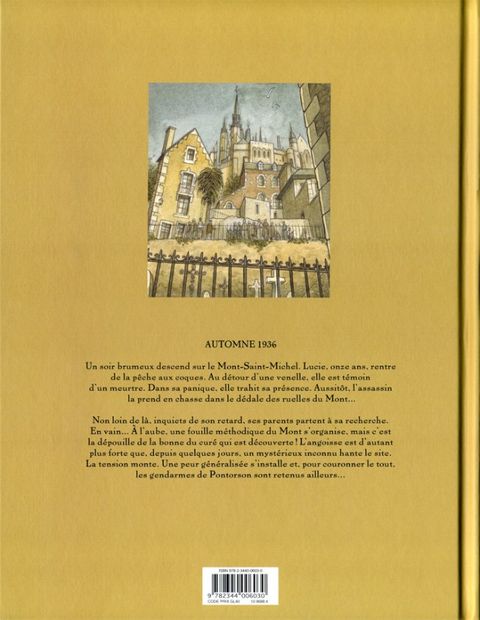 Automne 1936. Un soir, alors que et la brume vient de tomber sur le Mont-Saint-Michel, la petite Lucie est témoin d'un meurtre ! Terrorisée, la fillette a un geste de recul qui trahit sa présence et, aussitôt, se retrouve prise en chasse par le meurtrier. Dès l'aube, tous les habitants se mettent à fouiller la baie et le Mont à la recherche de Lucie, portée disparue, mais c'est le corps sans vie de la bonne du curé qui est retrouvé ! La panique est d'autant plus grande que depuis quelques jours, un mystérieux inconnu hante le site. Dans une atmosphère étouffante, tout le monde en vient à se méfier de tout le monde. Et pour couronner le tout, les gendarmes de Pontorson, la commune de la baie, sont retenus ailleurs...Dans le cadre de leur partenariat, les éditions Glénat et les éditions du Patrimoine s'aventurent en bande dessinée sur le célébrissime Mont-Saint-Michel, huis clos idéal pour un polar digne des meilleurs romans d'Agatha Christie !