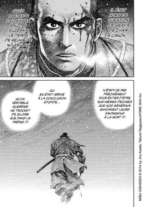 Depuis bien longtemps, Shichisaburô Ikeda a renié sa terre natale et tourné le dos à la voie du sabre. Il se souvient parfois avec tendresse, parfois avec effroi, de ses jeunes années au sein du Shinsen Gumi. Là où la milice était en proie à de nombreuses scissions, il fallait savoir prouver sa loyauté, quitte à perdre un peu de son humanité...Avec ce témoignage se dessine une nouvelle facette de Kan'ichirô Yoshimura, dont la philosophie aura marqué toute une génération de guerriers.Deux maîtres du manga, Takumi Nagayasu et Jirô Asada, vous présentent un nouveau mythe bouleversant autour du Shinsen Gumi.
