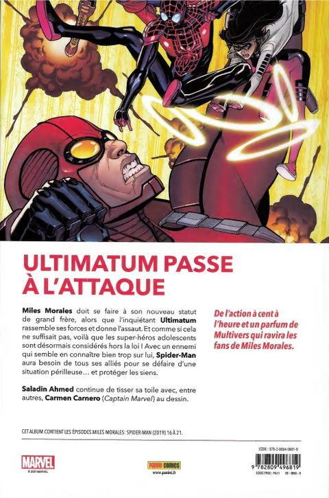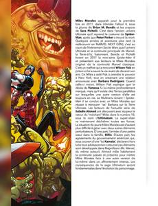Non seulement Miles Morales est pris dans la tempête Outlawed, qui voit le gouvernement interdire aux jeunes super-héros d'utiliser leurs pouvoirs, mais voilà qu'Ultimatum met ses plans à exécution. Tout l'univers de Spider-Man pourrait s'écrouler ! Un tournant pour le héros ! Suite au changement de formule du Softcover SPIDER-MAN, désormais essentiellement consacré à la série Amazing Spider-Man, Miles Morales s'élance dans sa propre série d'albums ! Un point d'entrée idéal pour les nouveaux lecteurs puisque ce volume contient une saga complète et accessible.