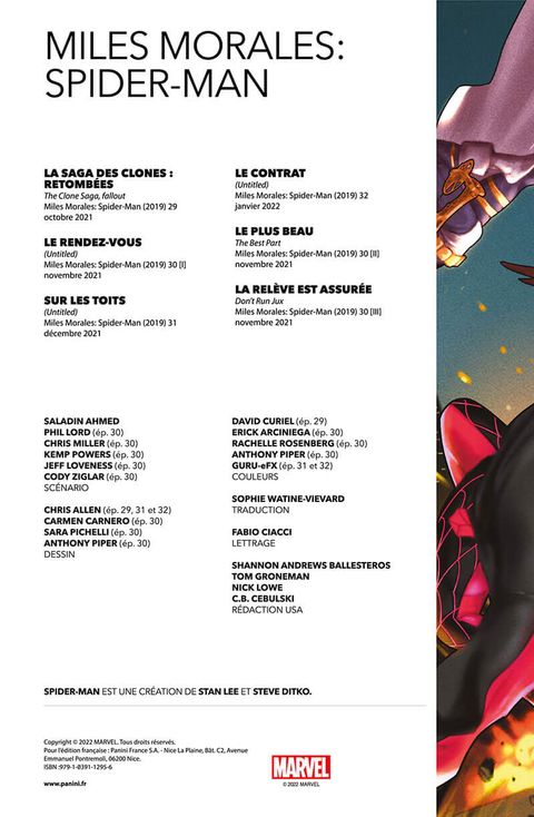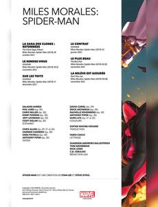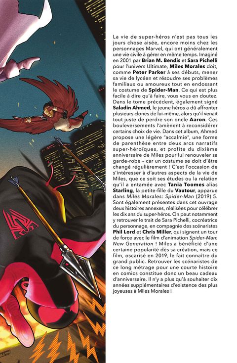 Miles Morales a vécu sa propre Saga du Clone et sa vie en est transformée pour toujours. Quoi de mieux qu'un nouveau costume pour fêter ça ! Mais alors que Spider-Man découvre l'amour, le Maître de Corvée semble bien décidé à l'éliminer. Mais pour quelle raison ? Une nouvelle ère commence pour le héros. Voilà dix ans que Brian Michael Bendis a créé Miles Morales ! Le personnage a eu tellement de succès qu'il est un des rares rescapés de l'univers Ultimate. Il a même eu droit à un dessin animé sacré meilleur film d'animation aux Oscars ! Une page se tourne pour Miles avec l'intervention d'autres jeunes héros, comme Ironheart, qui aura bientôt droit à sa série Disney+ !