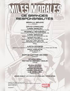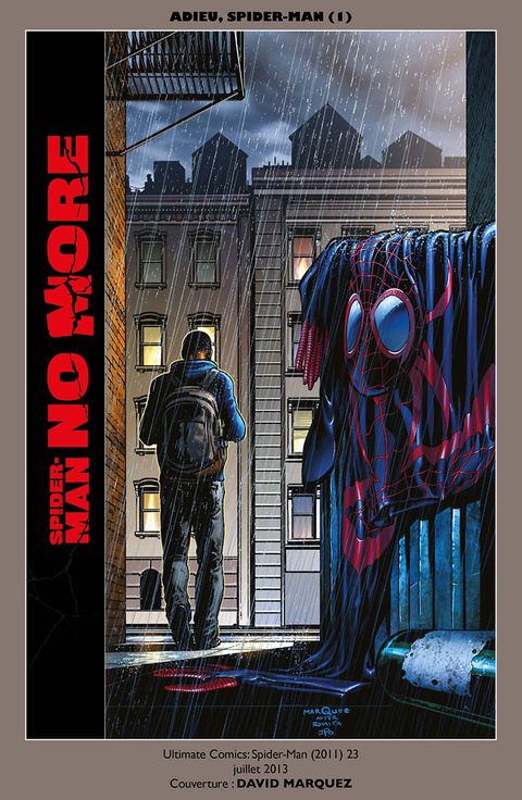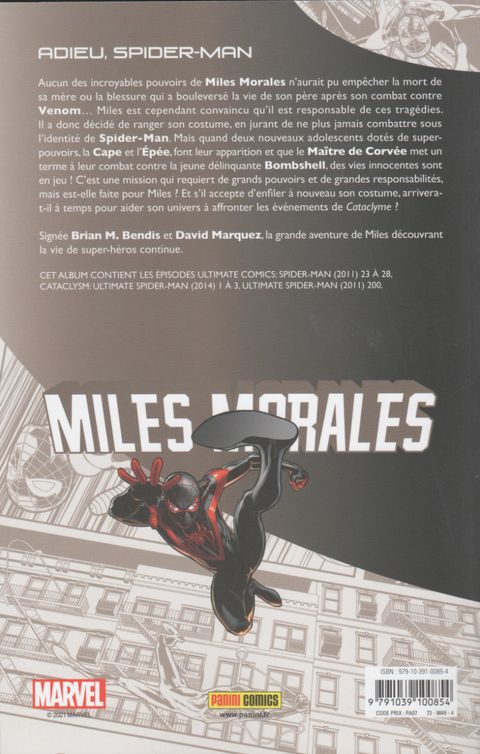 Spider-Man, c'est fini ? La tragédie a une nouvelle fois frappé Miles Morales et le voilà qui renonce à son identité de super-héros. Qui va prendre le relais en son absence ? Peut-être la Cape, l'Épée et Puissance 4 ? Face à la maléfique organisation Roxxon, Miles va pourtant rapidement devoir reprendre du service. Juste à temps pour la réapparition du Super-Bouffon ? Nous retrouvons les aventures de Miles Morales, le Spider-Man de l'univers Ultimate, dont la popularité a atteint des niveaux stratosphériques suite à la sortie de Spider-Man : New Generation. Brian Michael Bendis et David Marquez font le tour des événements marquants de la carrière de Spidey.