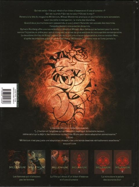 Ce premier volume réunit le diptyque retraçant l'enquête de Lisbeth Salander et de Mikael Blomkvist sur la disparition de Harriet Vanger, et plonge sans concession le lecteur au coeur des ténèbres. Ancien journaliste pour le magazine pamphlétaire "Millénium", Mikael Blomkvist est engagé par Henrik Vanger afin de résoudre le mystère de la disparition de sa fille, survenue 44 ans plus tôt. Son enquête l'amène à croiser la route de Lisbeth Salander, hackeuse de génie réfractaire à toute autorité. Ensemble, ils mettront au jour les pires noirceurs perpétrées par ces "hommes qui n'aimaient pas les femmes"... En 2013, Sylvain Runberg s'allie à Homs en vue d'adapter la trilogie culte de Stieg Larsson, Millénium. Un défi porté de main de maître par un duo admirable, qui vaudra au scénariste d'être choisi pour réaliser une suite à cette adaptation : Millénium Saga. Cette édition définitive du premier diptyque reprend désormais le découpage des tomes originaux. L'on y retrouve l'ensemble de l'intrigue autour de l'affaire Vanger et l'intensité de ce thriller impeccablement mis en images par Homs. Une occasion à ne pas rater de découvrir ou de redécouvrir "Millénium" comme vous ne l'avez jamais lu.