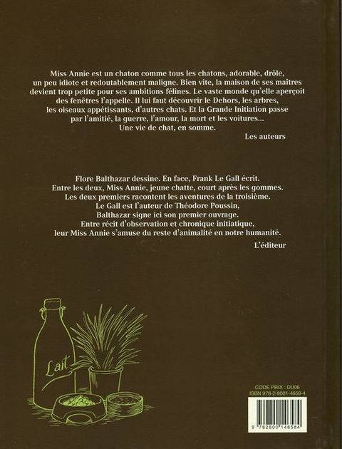 Curieuse et malicieuse, Miss Annie est prête à braver tous les interdits pour découvrir le vaste monde autour de la maison familiale. Elle nous raconte son quotidien de chat, en brocardant avec tendresse les travers de ses humains de maîtres.