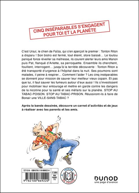 <div>L’entrée dans le tabagisme est toujours plus précoce. L’objectif des auteurs est de sensibiliser les enfants aux dangers du tabac avant l’entrée au collège. Pour cela, le projet, qui articule aventures dessinées, fiches informatives et activités/jeux, s’appuie sur deux principaux leviers :</div><div>• un discours santé pour mettre en garde contre les dangers du tabac ;</div><div>• un discours planète, peu connu, mais porteur pour les jeunes générations, en mettant en évidence le fait que chaque année, l’industrie du tabac est responsable de la destruction de 600 millions d’arbres, 200 000 hectares de terres, de la perte de 22 milliards de tonnes d’eau, de l’émission de 84 millions de tonnes de CO2, et du relargage dans la nature de milliards de filtres dont on retrouve les produits de dégradation dans les coins les plus reculés du monde, jusque dans les poumons des baleines...</div>