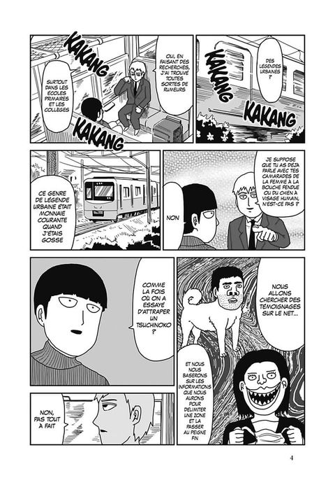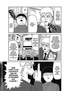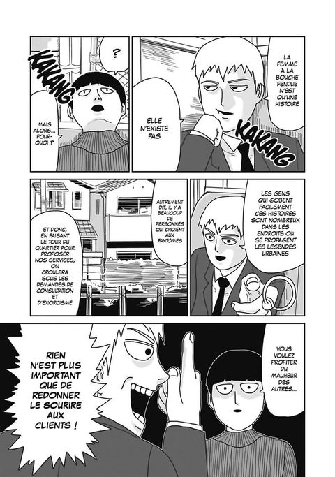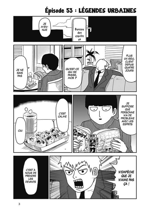 Mob continue son petit boulot d'exorciste avec son maître ! Mob travaille à mi-temps au bureau des esprits et autres trucs. Avec son maître Reigen, ils reçoivent diverses demandes de travail : élucider la légende urbaine de la femme à la bouche fendue, éliminer des mauvais esprits qui saccagent les écoles et les champs, accompagner des gens dans un lieu hanté, etc. Mais, petit à petit, des changements commencent à se manifester chez Mob... !
