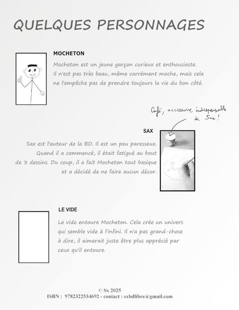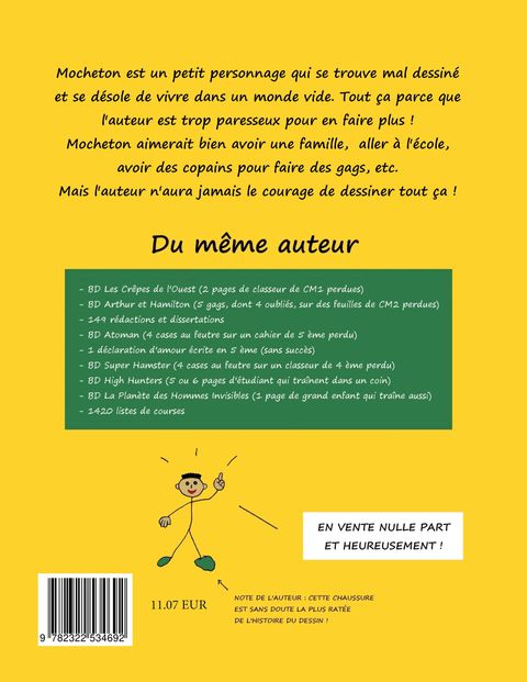 Découvrez Mocheton, un héros de BD vraiment bizarre ! Mocheton est un petit personnage qui se trouve mal dessiné et se désole de vivre dans un monde vide. Tout ça parce que l'auteur est trop paresseux pour en faire plus ! Pourtant, il aimerait bien avoir une famille, aller à l'école, avoir des copains pour faire des gags, etc. Mais l'auteur n'aura jamais le courage de dessiner tout ça ! Que va bien pouvoir faire Mocheton dans son monde tout vide ?