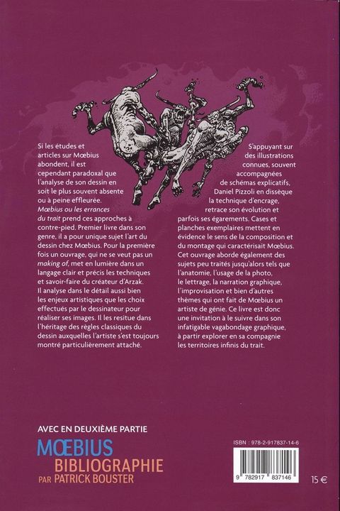 Si les études et articles sur Moebius abondent, paradoxalement l'analyse de son dessin en est le plus souvent absente ou réduite à sa plus simple expression. Prenant le contre-pied de ces approches, ce livre, premier dans son genre, a pour unique sujet l'art du dessin chez Moebius. Pour la première fois, un ouvrage qui ne se veut pas pour autant un making-off met en lumière dans un langage clair et précis les techniques et savoir-faire du créateur d'Arzak. Il analyse dans le détail les enjeux artistiques et les choix opérés par le dessinateur pour réaliser ses images, tout en les restituant dans l'héritage des règles classiques du dessin, règles auxquelles l'artiste était particulièrement attaché. Ce livre est une invitation à le suivre dans son infatigable vagabondage graphique, à explorer en sa compagnie les territoires infinis du trait. Le livre propose en deuxième partie une bibliographie complète par Patrick Bouster.