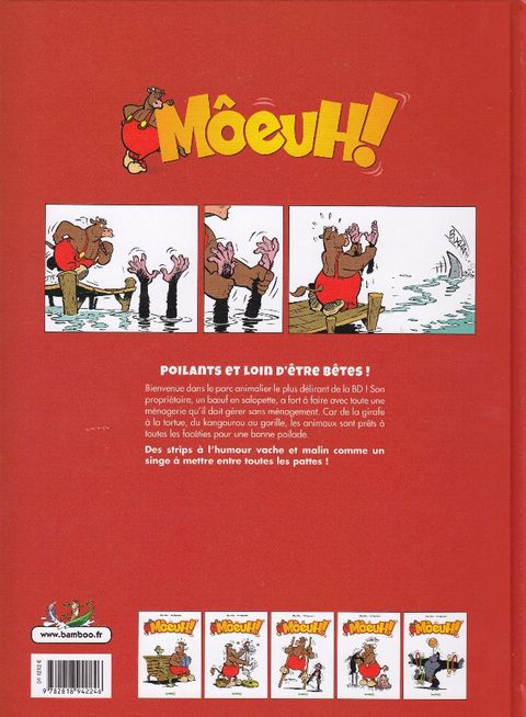 Bienvenue dans le parc animalier le plus délirant de la BD ! Son propriétaire Bof le boeuf, a fort à faire avec toute une ménagerie qu’il doit gérer sans ménagement. Car de la giraffe à la tortue, du kangourou au gorille, les animaux sont prêts à toutes les facéties pour une bonne poilade. Des strips à l’humour vache et malins comme un singe à mettre entre toutes les mains !