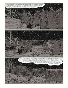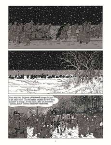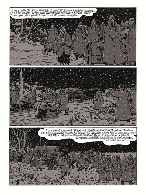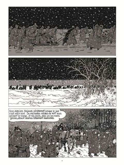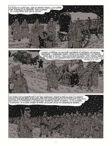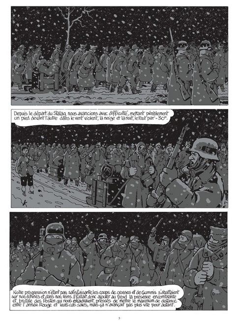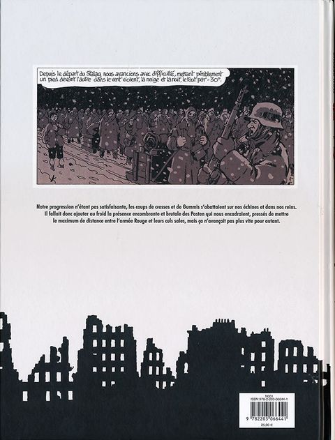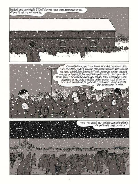 Fin 2012, Tardi entreprenait avec Moi René Tardi prisonnier de guerre au stalag II B la publication de l'un de ses projets les plus personnels, mûri de longue date : l'adaptation en bande dessinée des carnets de guerre de son père, où celui-ci tenait la chronique minutieuse de ses années de captivité dans un camp de Poméranie en Pologne, presque cinq années durant. Une manière touchante et pudique pour le dessinateur, qui se met lui-même en scène dans ce récit sous les traits d'un enfant, de renouer le dialogue avec ce père ombrageux aujourd'hui disparu, profondément meurtri par cette longue épreuve. Le premier volet de cette histoire s'achevait sur le départ des prisonniers de leur stalag fin janvier 1945, toujours encadrés par leurs geôliers, sous la menace de l'armée rouge soviétique lancée à l'assaut de l'Allemagne nazie alors en pleine débâcle. Le second volume de ce grand récit de guerre reprend là où le premier s'était arrêté, toujours sous le regard attentif de l'alter ego enfantin de Tardi : la longue marche des prisonniers dans un dénuement total et sous des températures extrêmes, la violence des garde-chiourme, la peur que suscitent les troupes russes toutes proches, les expédients pour s'assurer les meilleures chances de survie, les velléités d'évasion et ici et là quelques rares moments de récupération, comme la miraculeuse douche chaude négociée dans les locaux d'une ancienne brasserie. Autant de péripéties authentiques directement inspirées du carnet tenu au fil des jours à la mine de plomb sur « un cahier d'écolier coupé en quatre » par René Tardi, que l'on suit avec ses compagnons d'infortune tout au long de leur marche harassante à travers l'Europe dévastée, en direction de la France et de leurs foyers si longtemps espérés. Un témoignage d'une force exceptionnelle, et toujours le brio sans équivalent de l'un des plus grands auteurs de la bande dessinée contemporaine.