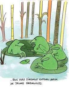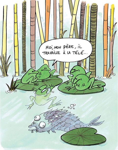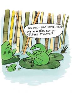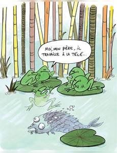 « Mon père, il présente la météo », « Mon père, il est torréador », « mon père, il a fait à la recherche de la nouvelle mare. »... Chacun y va de sa petite surenchère, cette après midi là, dans la mare des grenouilles. Jusqu'à ce que l'une d'entre elles ose... «Moi, mon père, c'est un héron »...