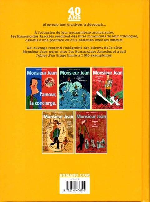 Entre les galères des copains qui débarquent sans crier gare pour s'installer sur le canapé, les crises existentielles des couples face à l'arrivée de leur premier enfant, les fiancées avides d'engagement et le caractère lunatique de sa concierge, Monsieur Jean essaie tant bien que mal de préserver son quant à soi. Parisien, écrivain et trentenaire, il est le héros de ces chroniques pleines d'humour sur la vie d'un citadin bien de son temps.