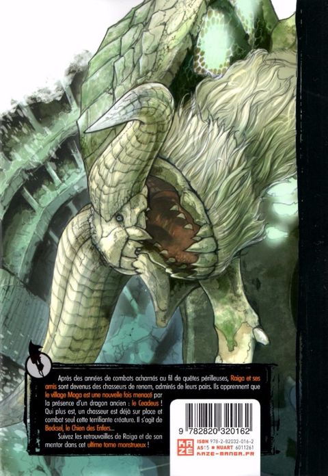 Après des années de combats acharnés au fil de quêtes périlleuses, Raiga et ses amis sont devenus des chasseurs de renom, admirés de leurs pairs. Ils apprennent que le village Moga est une nouvelle fois menacé par la présence d'un dragon ancien : le Ceadeus ! Qui plus est, un chasseur est déjà sur place et combat seul cette terrifiante créature. Il s'agit de Becksel, le Chien des Enfers... Suivez les retrouvailles de Raiga et de son mentor dans cet ultime tome monstrueux !