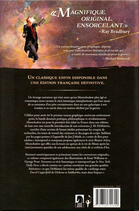 Un étrange narrateur qui n'est autre qu'un Moonshadow plus âgé et romantique nous raconte le récit initiatique interplanétaire qui l'ont mené de sa naissance d'un père extraterrestre dans un zoo galactique à son évasion et sa survie dans un univers déchiré par la guerre. Célèbre pour avoir été le premier roman graphique américain entièrement peint, la bande dessinée poétique, philosophique et révolutionnaire Moonshadow est pour la première fois édité en France dans une édition de luxe avec une nouvelle introduction de son scénariste, ]. M. DeMatteis, enrichie d'une section de bonus inédits présentant les croquis de recherches, les notes de travail des créateurs et des pages de script. Sublimé par les pages peintes à l'aquarelle de Jon J Muth, ce « conte de fées pour adultes » intemporel et marquant propose également le récit illustré Adieu, Moonshadow qui offre aux lecteurs un aperçu de la vie de Moon après les (més)aventures spatiales de son adolescence aux côtés de ce scélérat d'Ira. Restauré numériquement et présentant toutes les couvertures originales, ce volume comprend également des illustrations de Kent Williams et George Pratt. Savourez ce récit fantastique et intemporel que le New York Daily News a décrit comme un «poème envoûtant aux grandes qualités littéraires » et que DeMatteis lui-même qualifie de «mélange entre David Copperfield de Dickens et Siddhartha, mais dans l'espace ».