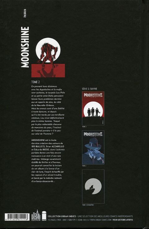 En prenant leurs distances avec les Appalaches et la mafia newyorkaise, le torpedo Lou Pirlo et sa petite amie Dalia pensaient laisser leurs problèmes derrière eux et repartir de zéro, du côté de la Nouvelle-Orléans. Mais les ennuis sont d'une fidélité à toutes épreuves, et depuis qu'il a été mordu par une terrifiante créature, Lou n'est définitivement plus le même homme. Traqué par le plus redoutable chasseur de monstres du pays, l'instinct de l'animal prendra-t-il le pas sur celui de l'homme ? Contenu vo : Moonshine Volume 2 (#7-12).