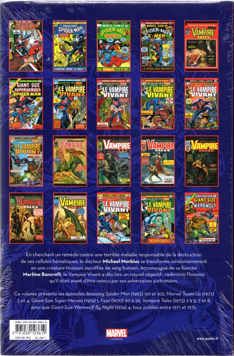 Le docteur Michael Morbius est frappé par une terrible malédiction. Suite à une expérience qui a mal tourné, le voilà victime d'une insatiable soif de sang ! Ce personnage incompris, souvent au bord de la folie, n'a pas affaire qu'à des super-héros, il doit aussi faire face à des démons et d'étranges sectes ! Basculez du côté sombre de l'univers Marvel avec cet album au ton horrifique et surnaturel. Les premières apparitions du personnage sont recueillies ici, avec des histoires en couleurs et d'autres en noir et blanc. C'est clairement une INTEGRALE à part !