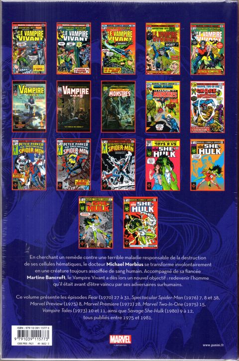 Morbius doit sauver Martine Bancroft d'une menace venue d'une autre dimension, mais la partie n'est pas facile car l'agent de la CIA Simon Stroud le traque ! En parallèle, le vampire tente désespérément de mettre un terme à sa soif de sang, tout en affrontant la menace de la Confrérie de Judas. Il part également à la poursuite d'un assassin et fait équipe avec bien des héros, parmi lesquels Spider-Man et Miss Hulk ! Les adaptations cinématographiques Marvel suscitent l'intérêt des fans pour la carrière des personnages, c'est ainsi le cas du Vampire vivant, revenu sous le feu des projecteurs depuis la sortie du film Morbius. Nous avons compilé dans cet album, toutes les apparitions du personnage sur la deuxième partie des années 70. Les lecteurs le trouveront en vedette d'histoires en noir et blanc dans les pages de Vampire Tales et le verront intervenir dans les séries des plus grands héros !