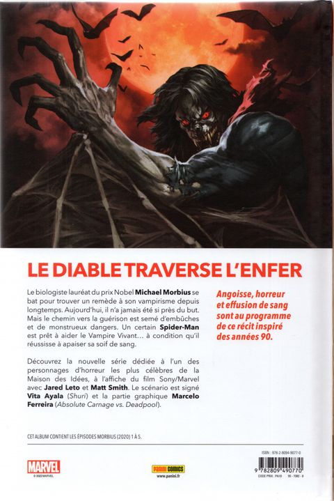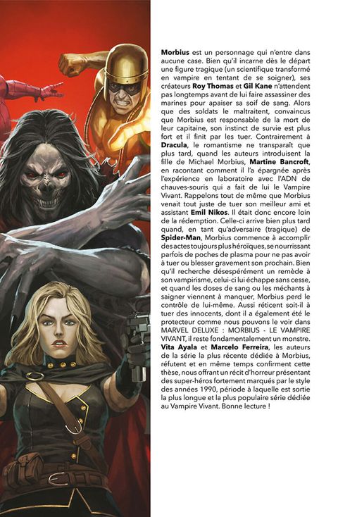 Michael Morbius pense avoir trouvé le moyen d'enrayer la maladie qui fait de lui un vampire. Mais dans la précipitation, le scientifique créé un remède qui s'avèrera bien pire que le mal dont il est atteint. D'anciens alliés et de nouveaux ennemis vont rapidement en faire les frais... Tandis que Morbius avec Jared Leto arrive dans les salles obscures le 5 août, voici la dernière mini-série en date consacrée au personnage. Les épisodes, publiés entre 2019 et 2020 aux Etats-Unis sont signés Vita Ayala (à qui l'on doit notamment Marvel Action : Black Panther et James Bond) et Marcelo Ferreira (Absolute Carnage vs Deadpool et War of the Realms : Punisher).