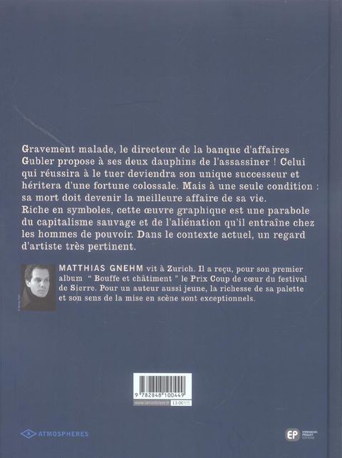 Gravement malade, le directeur de la banque d'affaires Gubler propose à ses deux dauphins de l'assassiner ! Celui qui réussira à le tuer deviendra son unique successeur et héritera d'une fortune colossale. Mais à une seule condition sa mort doit devenir la meilleure affaire de sa vie. Riche en symboles, cette oeuvre graphique est une parabole du capitalisme sauvage et de l'aliénation qu'il entraîne chez les hommes de pouvoir. Dans le contexte actuel, un regard d'artiste très pertinent.