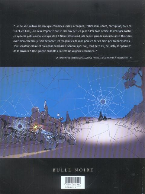 Alix Des Maures a grandi loin de son père, tout-puissant député-maire du village de Saint-Mont-Les Flots dans la Riviera. C'est sur la tombe de sa mère qu'elle le retrouve plus de quinze ans après l'avoir quitté. Désireux d'avoir sa fille à ses côtés, Romuald Des Maures la convainc de venir installer son cabinet d'avocate dans le village qu'il administre. C'est à une situation effrayante qu'elle se confronte à peine arrivée sur les lieux. Son père, vendu à un promoteur véreux, a entrepris de raser la vieille ville pour en faire un refuge de milliardaires. N'écoutant que son courage, la belle et courageuse Alix décide de se battre pour empêcher l'expulsion massive des habitants au mépris du danger. Corruption, permis de construire accordés en échange de pots de vin, intimidations, menaces. Un récit où la fiction semble sans cesse rejoindre la réalité ; voilà ce qu'ont concocté Bartoll et Legrain avec maîtrise et talent.