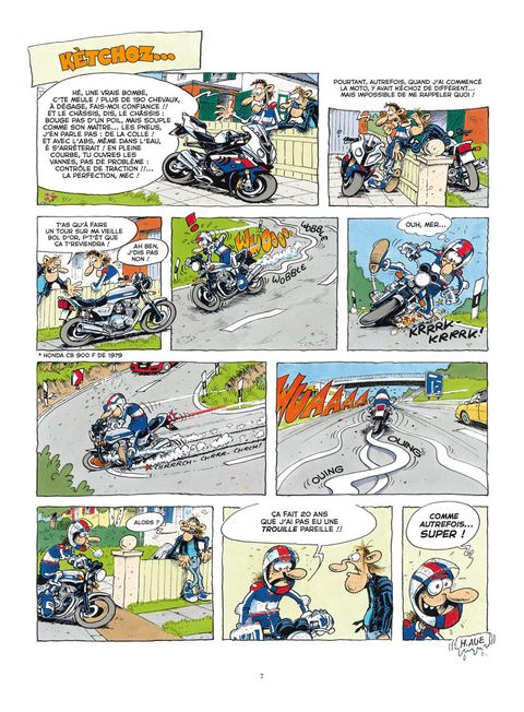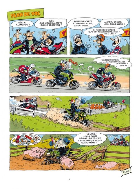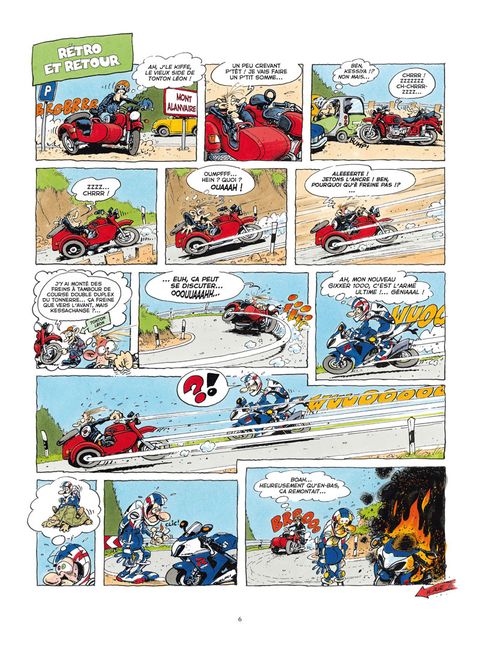 Nos amis motards ont renouvelé leurs engins, mais n'ont pas pour autant laissé tomber leurs anciennes bécanes : ils essaient de glaner discrètement les conseils de mécanique et de conduite des copains, mais heureusement pour nous, le résultat est plus souvent catastrophique que glorieux Avec des gags au dessin "gros nez" entre école belge et Ralf König, retrouvez une belle bande de bras cassés dont la seule passion est de manger des kilomètres et d'exploser les compteurs de la police !