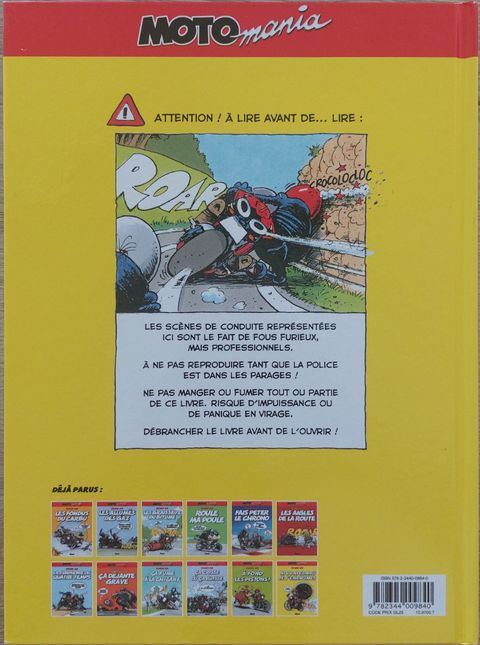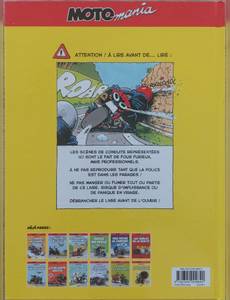 Avertissement aux lecteurs : les scènes de conduite représentées dans cet album sont effectuées par des fous professionnels. À ne pas reproduire sur vos routes, surtout si la police est dans les parages ! Laissez plutôt ça aux cinglés de Motomania qui sont de retour pour exploser une nouvelle fois la zone rouge tous azimuts, au mépris des règles de bonne conduite élémentaires !Avec ces gags au dessin "gros nez", entre école belge et Ralf König, retrouvez la belle bande de bras cassés de notre ami Holger Aue, dont la seule passion est de manger des kilomètres et d'exploser les compteurs de la police !