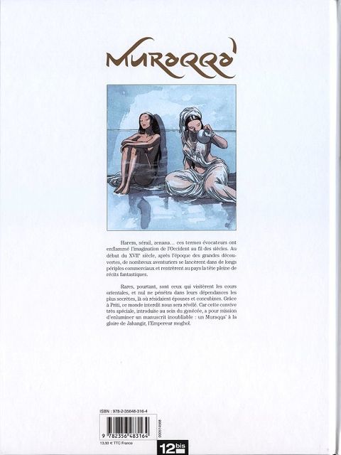 Muraqqa' est l'histoire d'une femme artiste à la cour du roi moghol Jahangir au début du XVIIe siècle. Ce terme signifie littéralement "patchwork", et il désigne un album pouvant réunir des miniatures, des dessins et des calligraphies, composé à l'intention d'un personnage de haut rang, ce qu'est amenée à produire Priti, l'héroïne de cette série de 3 tomes. Priti a 20 ans, elle aime vivre au grand air, croquer des animaux et se questionner à propos du monde qui l'entoure. Elle fait partie de la communauté Jain et voudrait pouvoir n'être vêtue que par le ciel, comme ces moines Digambara, bien que cela ne soit pas autorisé aux femmes. Nadim, l'eunuque de la reine Nur Jaha ayant remarqué ses talents au sein de l'école des arts de Mughal en a informé sa maîtresse. Car la reine Nur a depuis quelque temps le projet de faire mettre en images la vie des femmes du palais sur un Muraqqa'. Qui d'autre de mieux que Priti pourrait l'exécuter ? Cette jeune femme pure se retrouve ainsi à la cour d'un souverain musulman, spectatrice de la vie du sérail et de son époque...