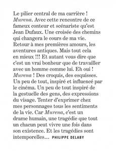 Encouragé par Jean Dufaux, Philippe Delaby dessina son plus grand chef-d'oeuvre, Murena. Cette série, qui ressuscite de façon magistrale la Rome impériale de Néron, fut primée par les jurys de nombreux festivals et reconnue comme un classique de la bande dessinée. Aujourd'hui encore, elle inspire le monde de l'illustration. Compilation du travail du maître, ce magnifique artbook rassemble des dessins, croquis, aquarelles et gouaches pour la plupart inédits. De format classique, il s'intégrera à la série, annonçant l'arrivée du nouveau dessinateur de Murena, Théo.