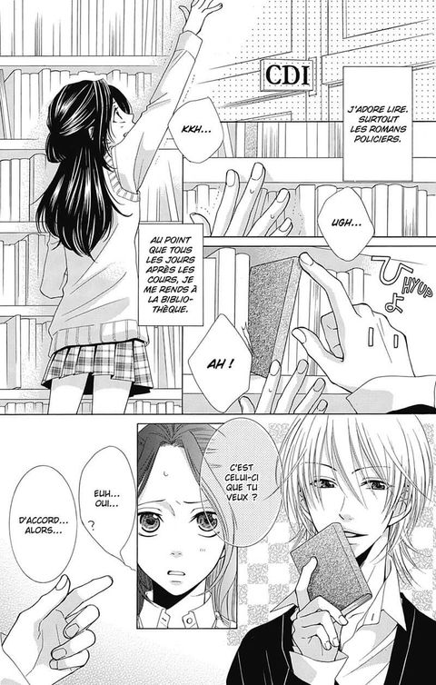 Je m’étais assoupie dans la bibliothèque quand soudain… un garçon m’a volé un baiser ! avant de s’éclipser sans que j’aie le temps de voir son visage… Qui cela peut-il être ?! Shinoda, le beau gosse du lycée ? Mikoshiba, l’intello ténébreux ? Mon ami d’enfance, Mogami, en serait-il capable ? Ou alors Hachiya, le petit nouveau ? Pour retrouver le coupable, c’est surtout mes sentiments que je vais devoir interroger !