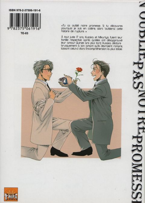 Depuis ce jour où ils ont décidé de fuir leurs familles pour vivre ensemble, Kusaka et Mikuriya ne se sont jamais quittés. Quinze ans plus tard, l’excitation et le sentiment de nouveauté que leur procurait leur vie commune, les petites promesses qu’ils se faisaient entre eux, tout ça n’est plus qu’un charmant souvenir. Désormais trentenaires, les deux hommes vivent une relation sans heurts et toujours assez fusionnelle. Jusqu’au jour où Kusaka déclare, sur ce qui semble être un coup de tête, vouloir y mettre un terme.