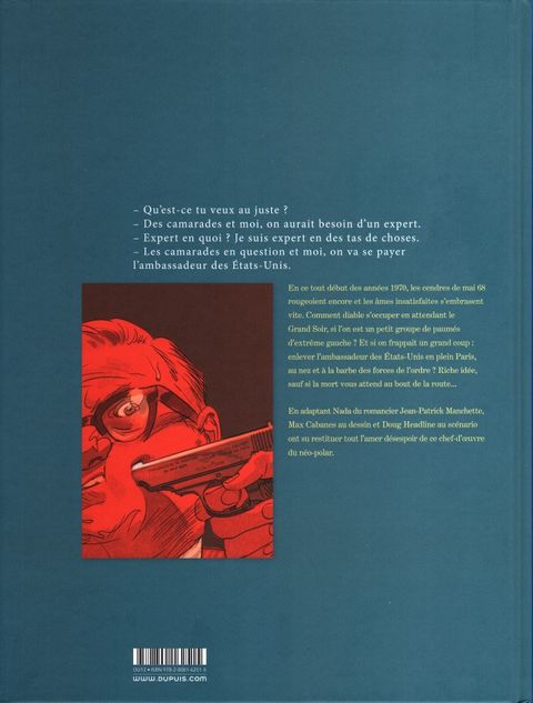 Ils sont six : Épaulard, l'expert vieillissant ; D'Arcy, l'alcoolique violent ; Buenaventura Diaz, le caméléon aux identités multiples ; Treuffais, le prof de philo désabusé ; le jeune Meyer, dont la femme folle finira bien par le tuer un de ces quatre ; et Cash, la putain auto-proclamée à l'intelligence troublante. Des profils aussi disparates que leurs passés respectifs. Pourtant, ensemble, ces paumés d'extrême gauche formeront le groupe « Nada ». Leur premier coup d'éclat : enlever l'ambassadeur américain, en visite discrète dans une maison close parisienne. Une opération aussi risquée exige audace et maîtrise. Mais si le gang de marginaux l'exécute sans coup férir, la suite ne sera pas si simple. Chargé de l'affaire, le rusé commissaire Goémond va mener une sanglante traque aux 'anarchistes'... Entre morts inutiles, dégâts collatéraux et pressions politiques, les membres du groupe « Nada » s'apprêtent à passer les plus longues heures de leur existence... Avant quelle fin ? Chef-d'oeuvre du néo-polar écrit en 1972 par Jean-Patrick Manchette, puis adapté au cinéma par Claude Chabrol, « Nada » dessine les trajectoires écorchées d'une poignée de desperados révoltés. Un roman noir magnifiquement adapté en bande dessinée par Max Cabanes et Doug Headline, qui en restituent tout l'amer désespoir. Tirage de tête à 777 ex. avec frontispice numéroté et signé par les auteurs.