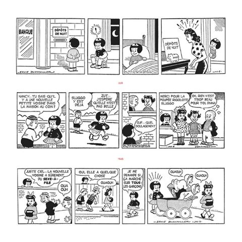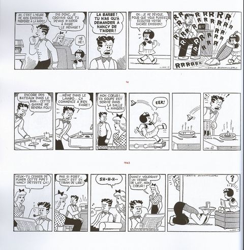 Pour beaucoup, Nancy représente la quintessence de l'art du comic strip. Un dessin réduit à l'essentiel, où rien n'est superflu, où chaque trait est pleinement sémiotisé, au service de l'idée. Un ancrage dans le quotidien, le vécu du personnage rejoignant celui des lecteurs qui avaient rendez-vous avec Nancy dans leur journal. Et une obsession : le gag. Qu'ils relèvent d'un humour visuel ou d'un jeu de mots, les gags inventés par Ernie Bushmiller paraissent le plus souvent d'une simplicité désarmante. Cependant beaucoup s'offrent à une autre lecture, plus sophistiquée. Car l'auteur ne cesse de jouer avec les lois de la figuration, de la ressemblance, de l'illusion d'optique, et avec les codes mêmes du dessin. Rien d'étonnant, donc, si les artistes et les intellectuels (de Andy Warhol à Art Spiegelman en passant par Joe Brainard) ont exprimé leur admiration pour cette oeuvre, devenue totalement culte. Il était temps que le public français (re)découvre Nancy - très mal publiée autrefois sous le titre Arthur et Zoé. Les strips des années 1943 à 45 reflètent le contexte particulier de la guerre : restrictions, tickets de rationnement, mobilisation des enfants, etc.