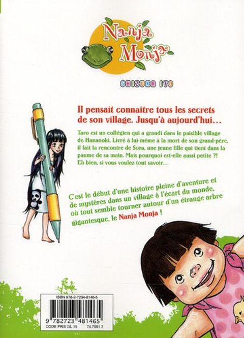 Taro vit dans le petit village idyllique de Hananoki. La vie y est paisible comme il se doit à la campagne. Enfin, pas si paisible que cela, puisqu'un jour Taro découvre que la forêt renferme un bien étrange mystère : elle est emplie d'un étonnant petit peuple qui vit autour des humains sans se dévoiler à eux. du moins jusqu'ici ! On nage en pleine ambiance Totoro, avec cette histoire bucolique, familiale, mettant en scène des esprits de la forêt et on a le côté sympathique des Minipousses, dans la description du petit peuple, dans ses habitudes de vie. Manga bienveillant et sympathique, invitant au rêve, et résolument écolo bien entendu, Nanja Monja est affublé d'un dessin vivant aux traits assez universels. Nanja Monja peut donc plaire à un large public, au-delà des fans purs et durs de manga. Le titre de surcroît est relativement court, puisque terminé en 6 volumes !