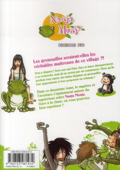 Les grenouilles seraient-elles les véritables maîtresses de ce village ?! Sora a disparu ! Avec son ami Futa, Taro se lance désespérément à sa recherche, mais ils ne savent par où commencer. Alors qu'ils perdent tout espoir. des lutins déguisés en grenouilles leur apparaissent et leur proposent un échange ! Dans ce deuxième tome, le mystère et l'aventure s'épaississent autour du mystérieux arbre Nanja Monja. Gare à la chute, où vous pourriez bien rapetisser !