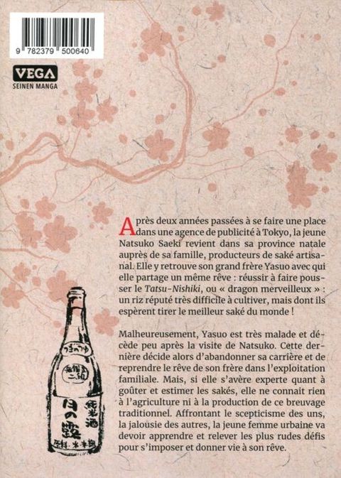 Natsuko Saeki réussira-t-elle a brasser le meilleur saké du monde, issu d’un riz unique, réputé impossible à cultiver ? Natsuko Saeki est une employée de bureau à Tokyo, mais elle ne s’épanouit pas dans son travail. Ses supérieurs ne voient en elle qu’une subalterne juste bonne à faire des photocopies et servir du café. Mais un jour son frère tombe malade et l’opportunité s’offre à elle de rentrer auprès de sa famille pour l’aider. Or Natsuko est issue d’une famille de modestes brasseurs de saké, et tente depuis des années de brasser un saké particulièrement savoureux et unique. Motivée par ce défi familial, Natsuko, remplaçant son frère, va se plonger corps et âme dans le travail du saké et tenter de se faire une place dans un milieu très traditionnel et dominé par les hommes. Réussira-t-elle à brasser le meilleur saké du monde, issu d’un riz unique, réputé impossible à cultiver ?