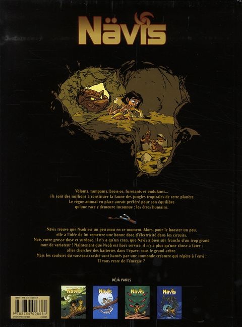 En voulant rebooster un peu Nsob qu'elle trouvait mollasson, Nävis a provoqué une surcharge d'énergie et a fait griller les circuits de son robot adoré. Seule sa tête fonctionne encore, attachée à une grosse batterie, qui ne durera pas longtemps. Nävis doit récupérer de toute urgence un chargeur localisé... dans le vaisseau crashé, hanté par un robot sans pitié. La tâche sera périlleuse ! Il existe plusieurs rééditions avec même isbn/ean et des dos différents