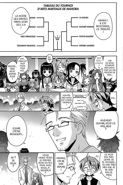 Le tournoi d'arts martiaux de la fête de Mahora vient de débuter. D'abord pressenti comme un évènement mineur, ce dernier s'est transformé en attraction de tout premier plan, à laquelle participent élèves et professeurs. Après des éliminatoires qui ont permis aux favoris de se distinguer, les combats les plus attendus débutent enfin avec, en particulier, l'affrontement de Mana contre Kû-Fei ou, encore plus attendu, celui de Negi contre Takamichi... Tout cela sous l'oeil attentif du mystérieux Kûneru Sanders, qui progresse lui aussi dans le tournoi...