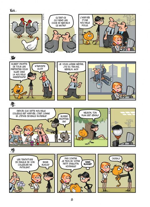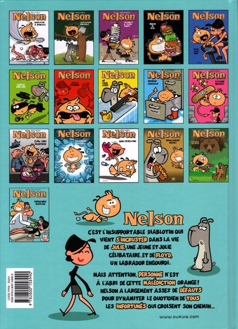 Nelson reste égal à lui-même : une véritable calamité ambulante et débordante d'imagination lorsqu'il s'agit de rendre la vie impossible à Julie, sa jeune et jolie maîtresse, et à Floyd, son labrador un peu empoté. Si seulement Julie pouvait oublier son infernal diablotin pendant la journée, mais, pas de chance, Nelson adore l'accompagner au bureau où il perturbe les (bonnes ?) relations entre collègues. Comme la fois où sa mauvaise influence sur Hubert, le collègue un peu crétin de Julie, a amené celui-ci à photocopier certaines parties de son corps après avoir snifé des feutres à l'alcool... Avec Nelson, Julie a un diablotin à temps plein qui ne lui réserve que de déplorables surprises ! Créé en 2001 dans le quotidien suisse Le Matin, le petit diablotin orange de Bertschy en est vite devenu l'incontournable mascotte. À ce jour, Nelson a vécu plus de 3 800 strips. Et ça ne fait que commencer !