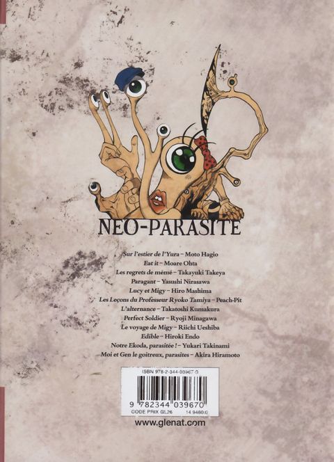 Douze grands auteurs se sont rassemblés pour créer cette anthologie officielle autour de l'oeuvre culte Parasite.Suite, spin-off, mélange d'univers, aspects non évoqués dans le manga... Chaque auteur a rendu hommage au manga de Iwaaki à sa façon : réflexion sur l'humanité par Moto Hagio, combats militaires par Ryoji Minagawa, parodie érotique par Akira Hiramoto (Prison School), ou improbable fusion de Lucy et Miggy par Hiro Mashima (Fairy Tail)... L'univers de Parasite est décidément un très bon point de départ pour développer son imagination !